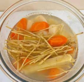 2、將所有食材洗凈切成小塊,放入鍋內(nèi),小火慢煮40分鐘即可飲用。